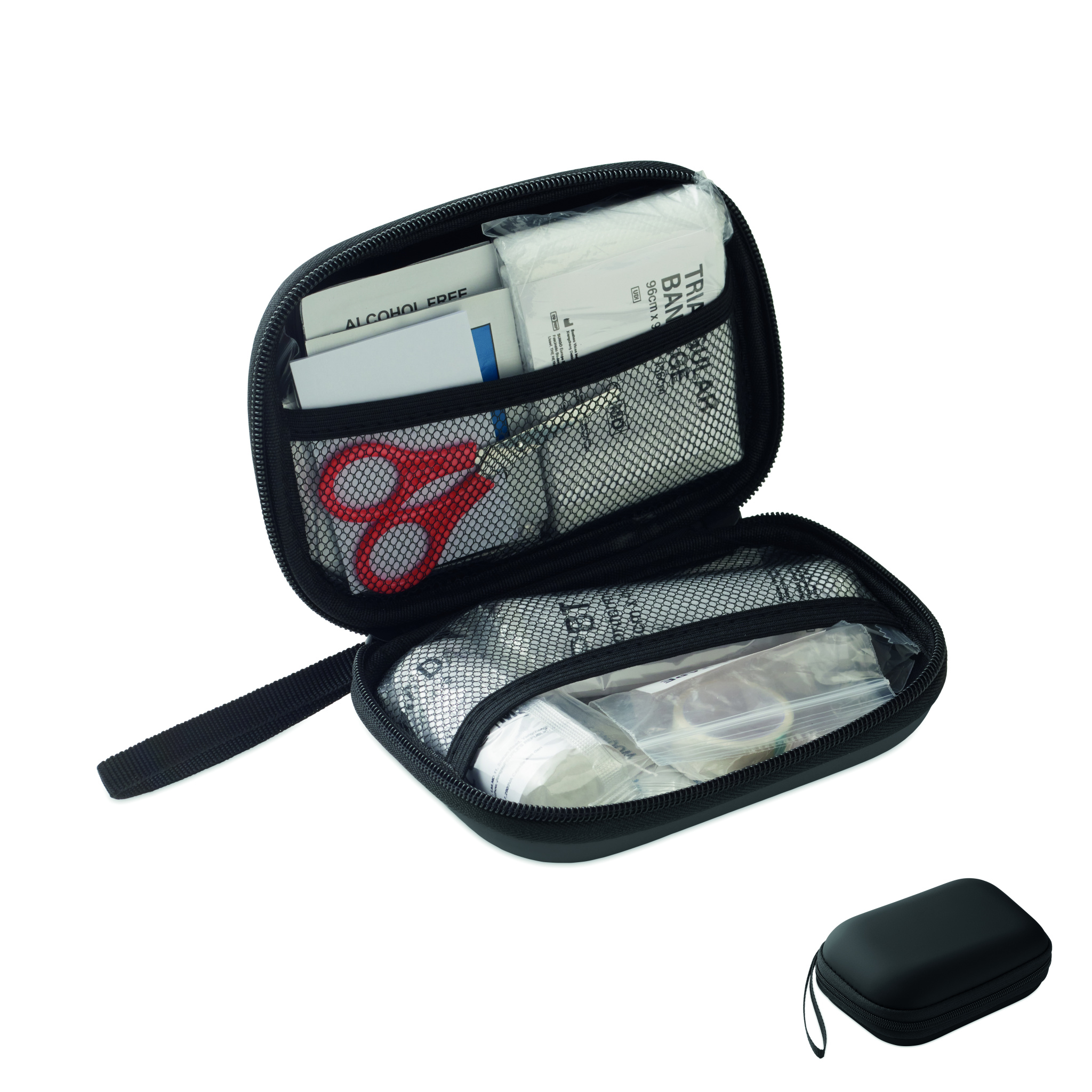 Erste-Hilfe-Set im Hartschalenkoffer aus PU. Inhalt: Handschuhe, 1 Decke, 1 Klebeband, 2 Verbände, 1 Schere, 4 Tupfer, 10 Pflaster und 6 Reinigungstücher. Nicht außerhalb der EU erhältlich.