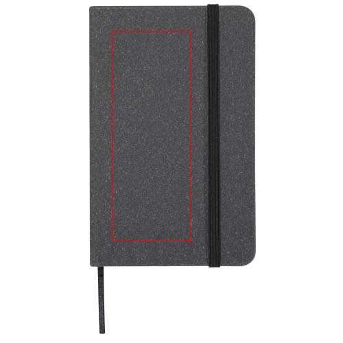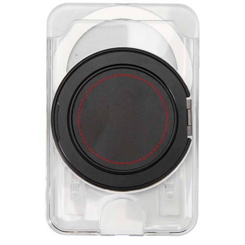 Ein praktisches Präsentset mit einem A6 Notizbuch und einer MagSafe Wallet. Das Notizbuch hat einen dunkelgrauen Einband aus recyceltem Kunststoff, 80 linierte cremefarbene Blätter aus 70 g/m² Papier und einen schwarzen Gummizugverschluss. Die transparente MagSafe Wallet bietet Platz für eine Karte und lässt sich magnetisch an iPhone Modellen ab dem iPhone 12 befestigen. Zusätzlich wird ein Metallring für die Verwendung mit anderen Smartphones mitgeliefert. Beide Artikel sind in einer eleganten, schwarzen Box aus Karton verpackt.