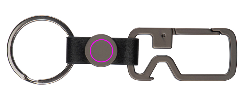 Graphitfarbener Schlüsselanhänger mit Karabiner, Schlüsselring und Flaschenöffner. Ihre Werbung wird auf das runde Stück graviert.
