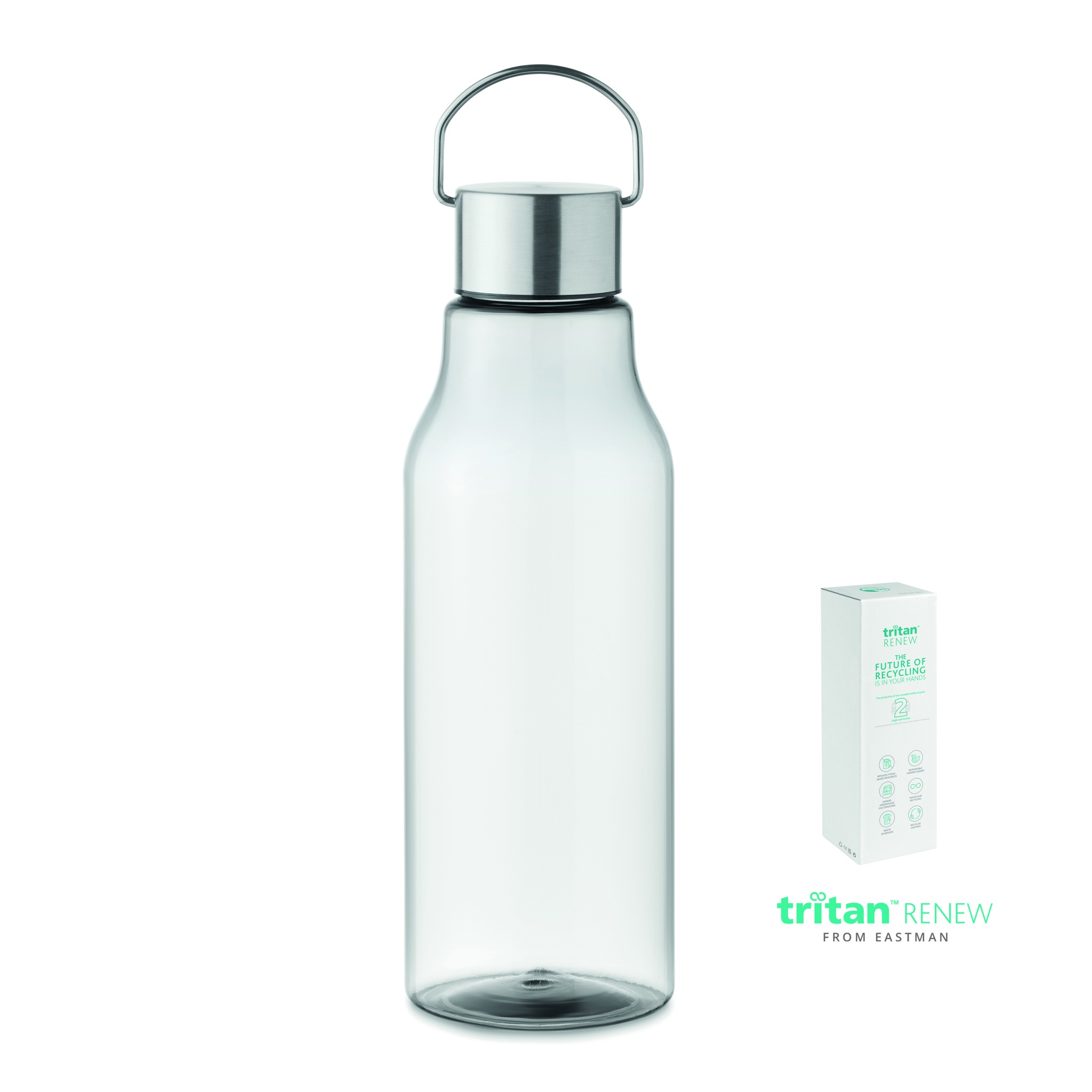 Trinkflasche aus Tritan Renew™. BPA-frei. Verschluss aus Edelstahl mit Henkel. Auslaufsicher. Füllmenge: 800 ml. Dieses Produkt wird aus Material mit bis zu 50% Recyclinganteil hergestellt. ISCC zertifiziert.