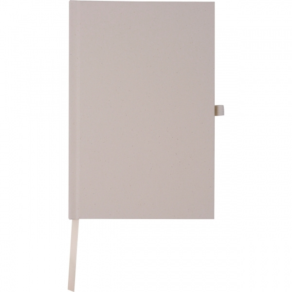 A5 notebook with a cover made from coconut shells and 160 lined pages of recycled paper. The notebook also features a bookmark and a pen loop. Your logo is printed on the outside of the cover.