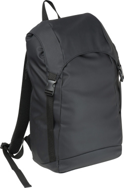 Large polyester backpack with water-repellent PU coating. It features a spacious main compartment with a laptop sleeve and padded back, as well as two zippered pockets on the right and left exterior sides. It includes a drawstring closure and a flap that keeps the contents dry during rain.