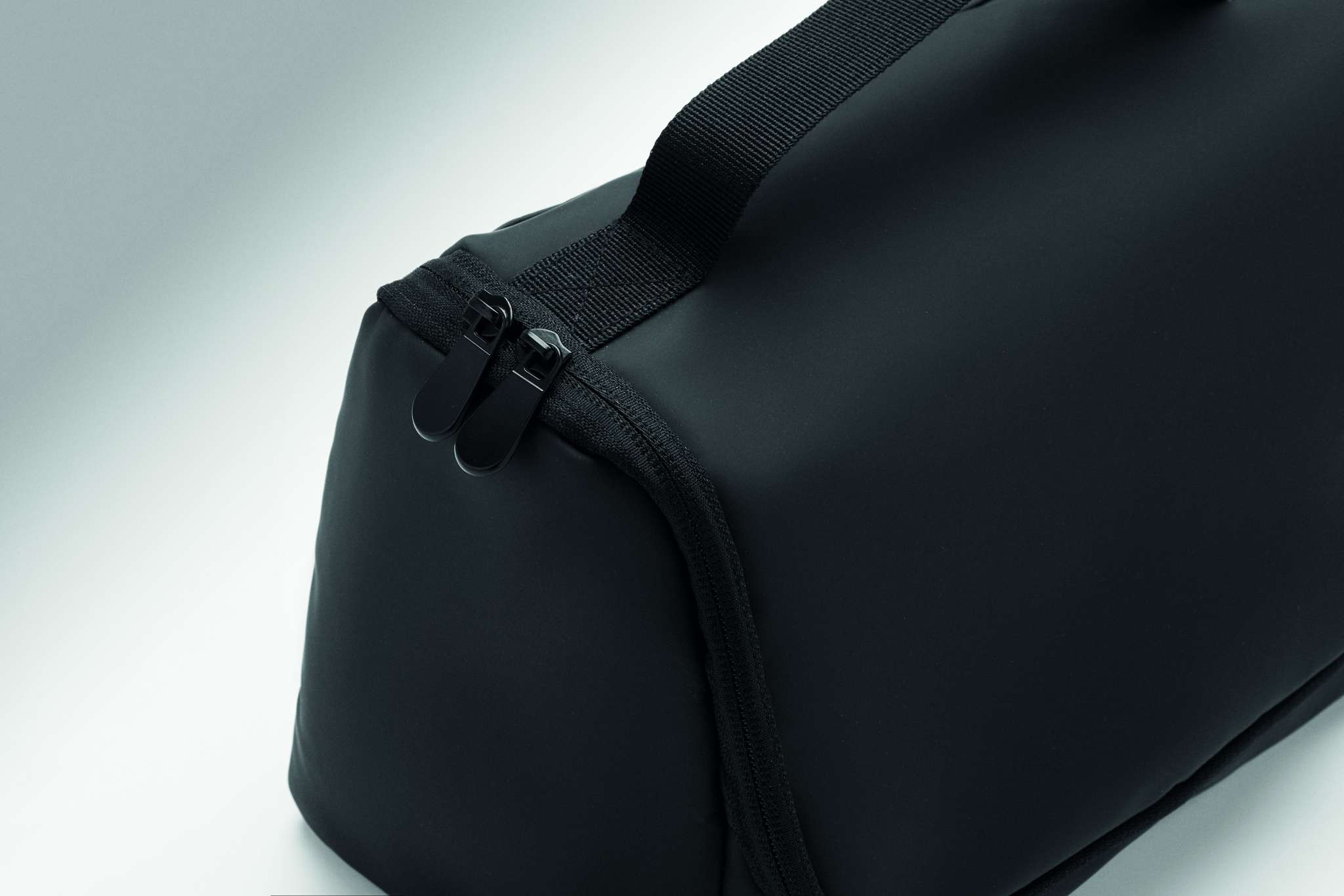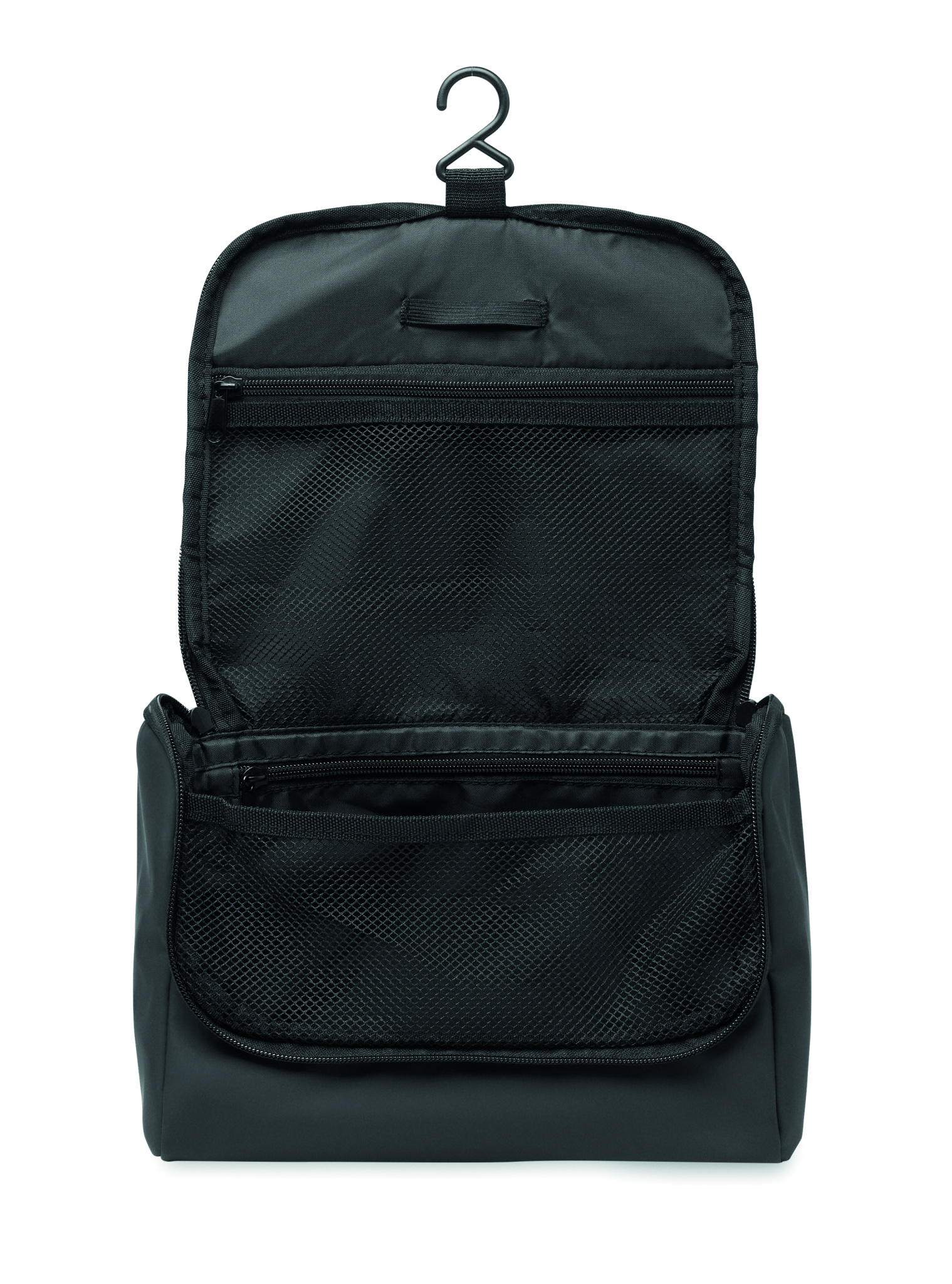 Cosmetic organiser bag in soft PU with hanging hook and 210D RPET lining. One large main compartment with inner zippered mesh compartment and 1 mesh compartment.