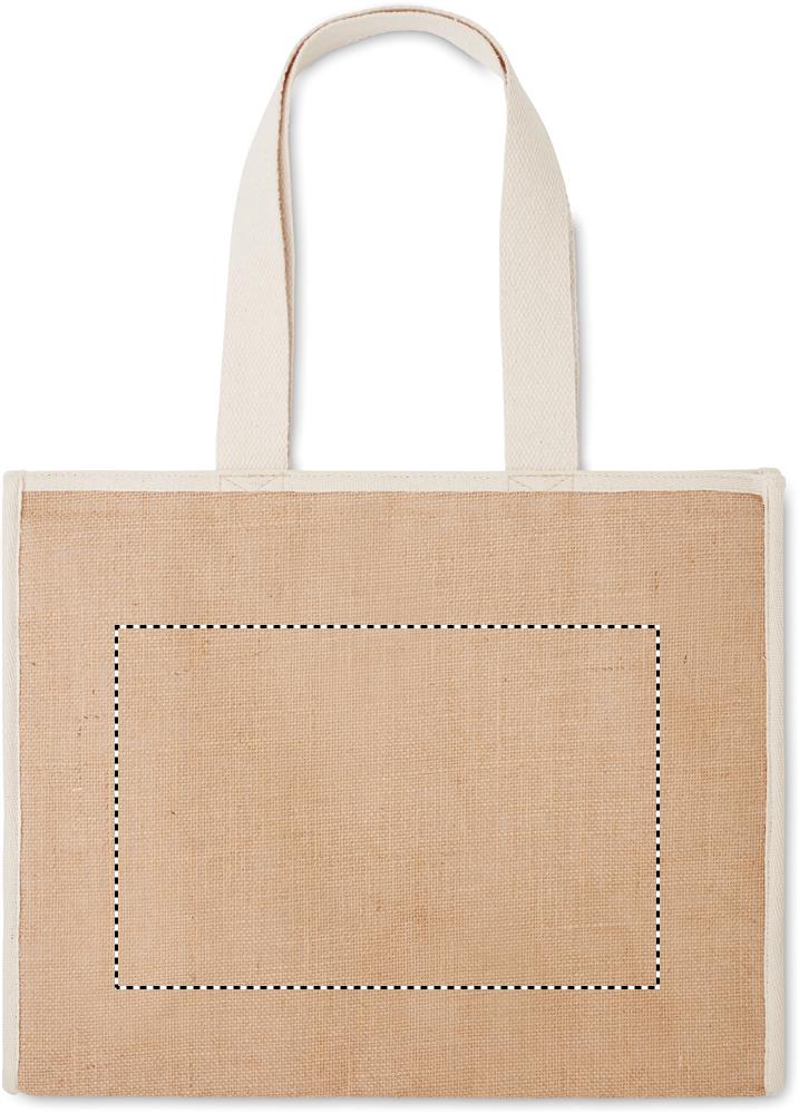 Jute shopping and cooler bag with long handles, laminated and with hook and loop closure, front with canvas pocket and cotton webbing.
