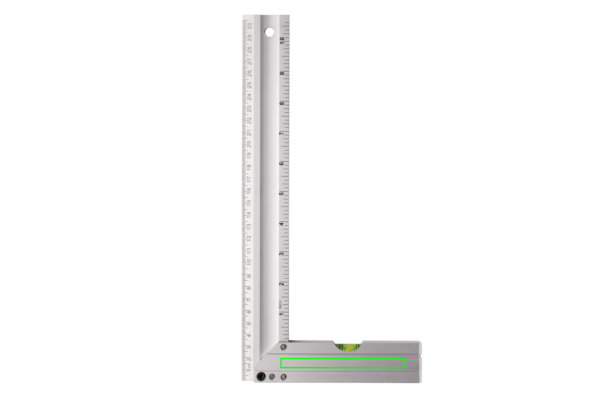 Professional aluminum square ruler with integrated level optimal to measure corners and draw squares. Double sided printing with indication in CM (30) and inches (10) Level Accuracy 0.5mm