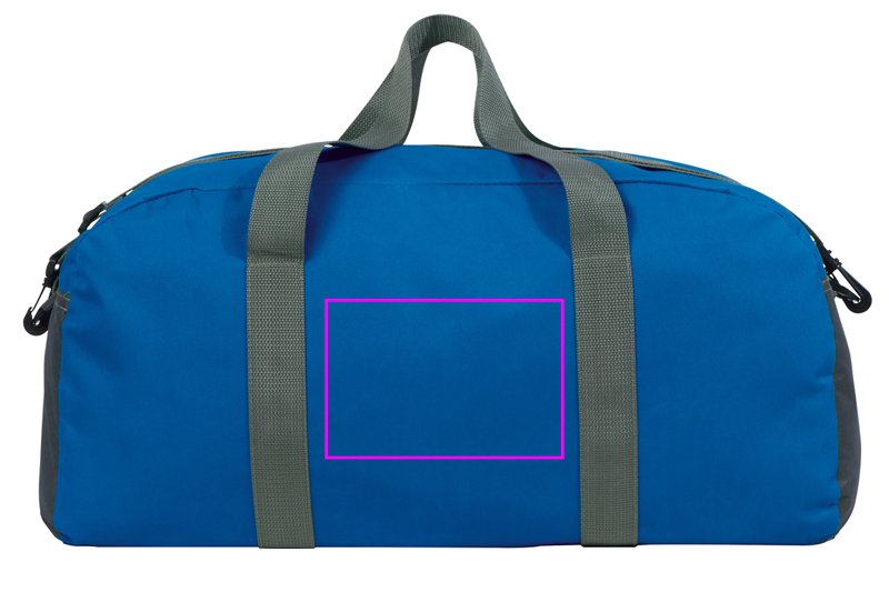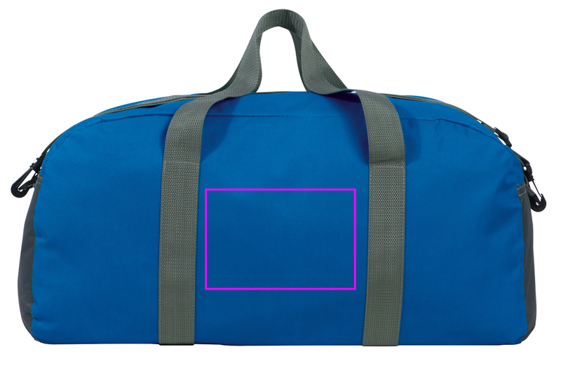 Large 600D polyester sports bag with large inner compartment, carrying handles, and adjustable shoulder strap. We print your logo on one side.