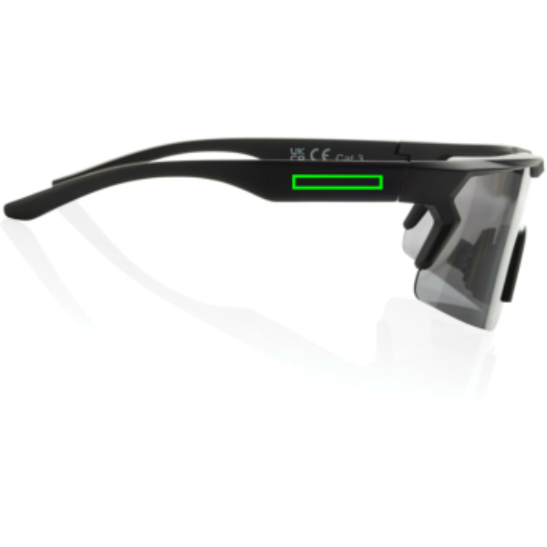 Sport design polarized sunglasses made with RCS certified recycled PC frame. Total recycled content: 65% based on total item weight. RCS certification ensures a completely certified supply chain of the recycled materials. Including recycled RPET sleeve to store the glasses in .The lenses are polarized which eliminates reflecting sunlight, making it ideal for sports and outdoor activities. Conform EN ISO 12312-1, UV 400 and CAT 3. Packed in FSC® gift packaging.