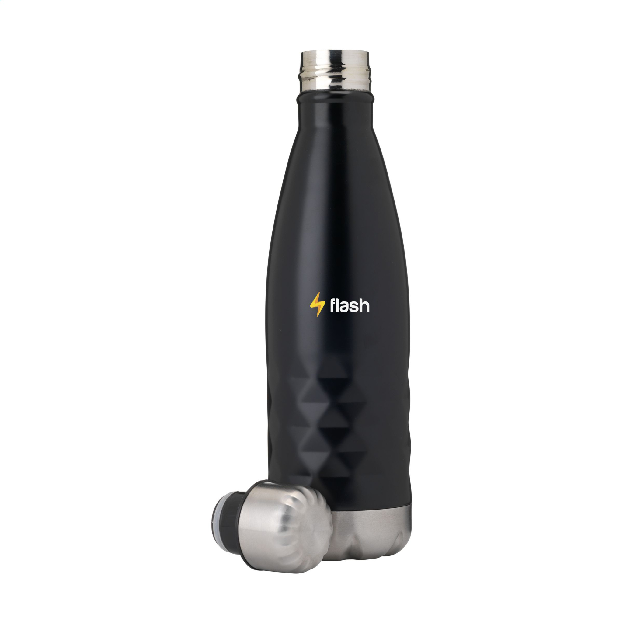 Double-walled, leak proof stainless steel water bottle/thermo bottle with distinctive 3D geometric diamond pattern. Suitable for maintaining the temperature of cold or hot water. Capacity 500 ml. Each item is individually boxed.