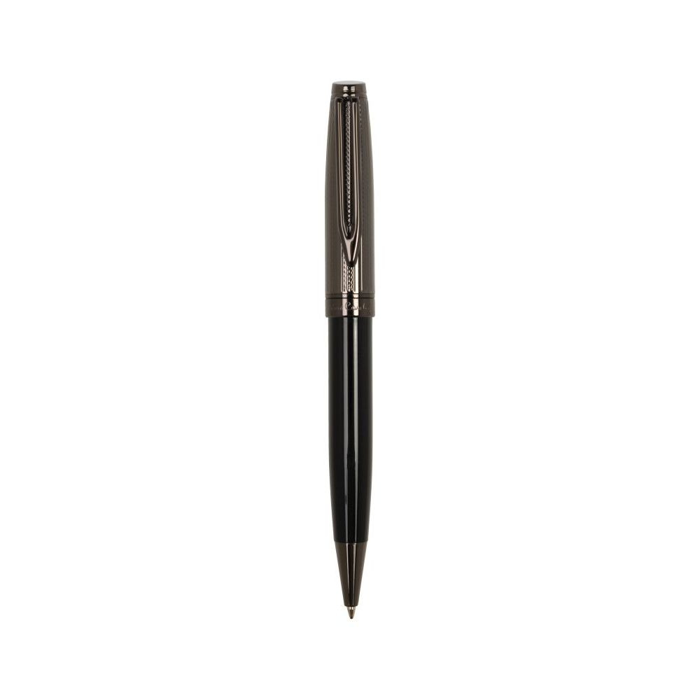 Luxury Pierre Cardin writing set with an elegant design, including a ballpoint pen and a fountain pen. The bodies of both instruments are made in glossy black with the upper parts in a gunmetal shade. The ballpoint pen features a rotating mechanism and a high-quality blue refill with a 1 mm tip, while the fountain pen is equipped with a standard blue ink cartridge, ensuring smooth and precise writing. The set comes packed in an elegant gift box with a certificate of authenticity.