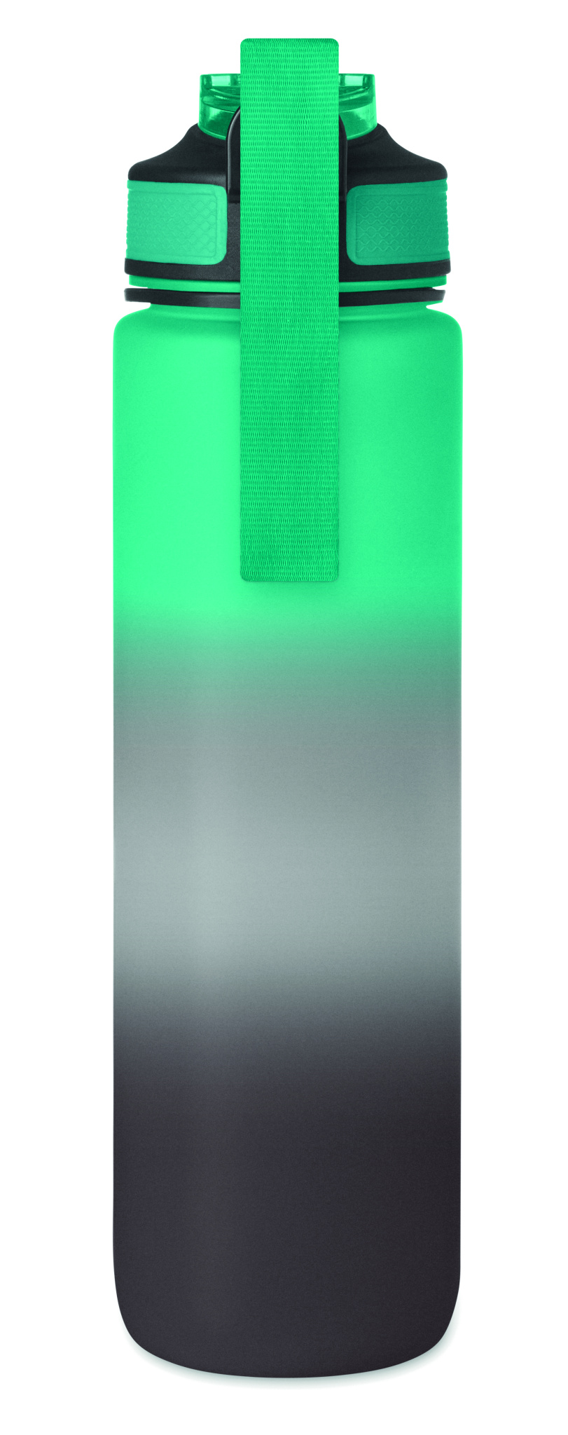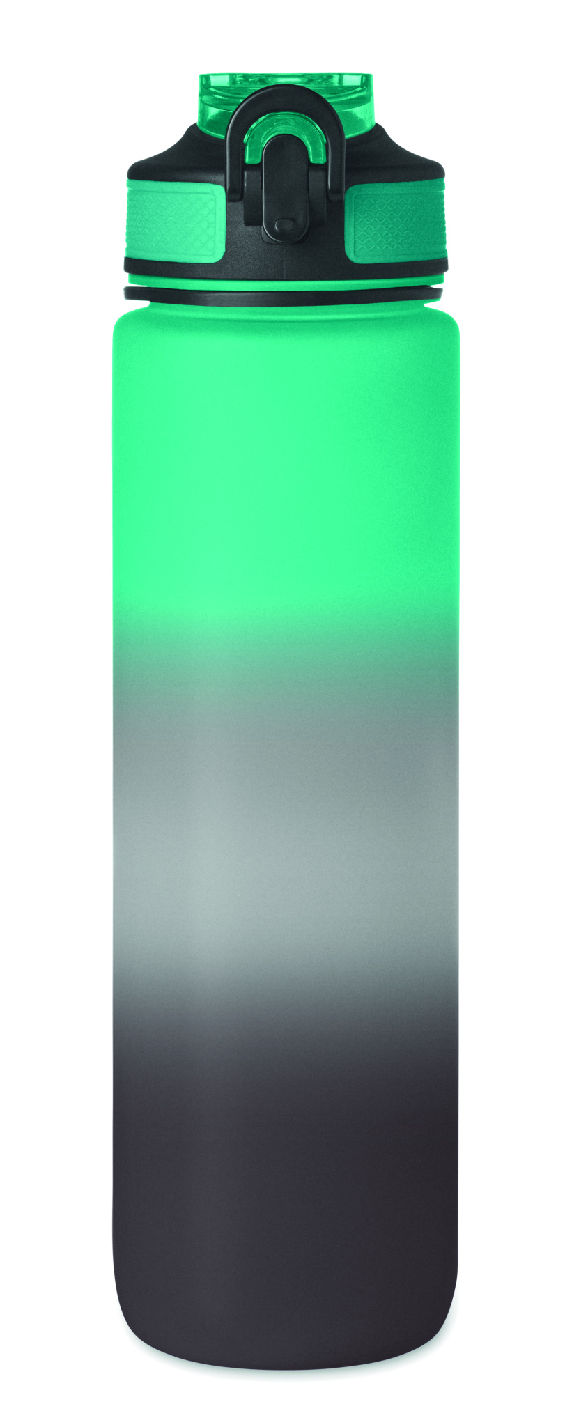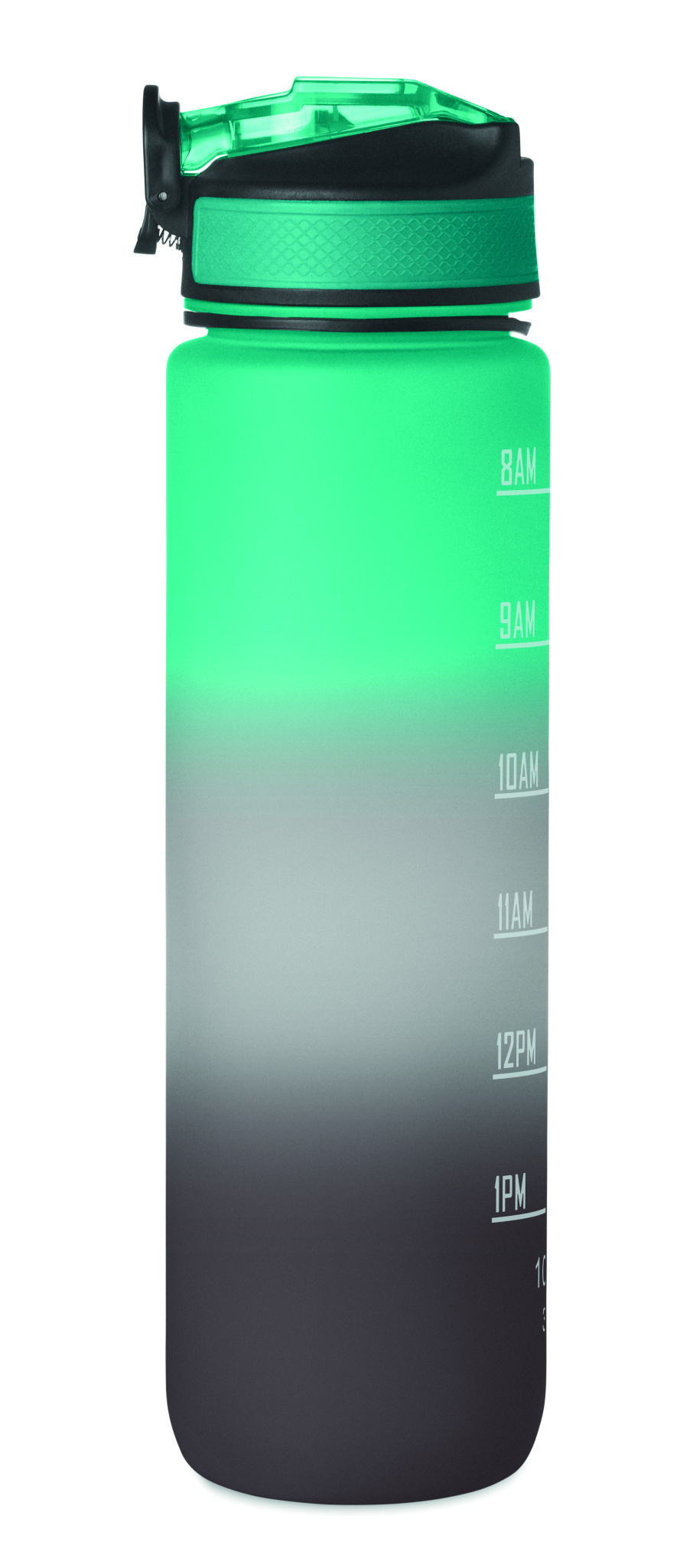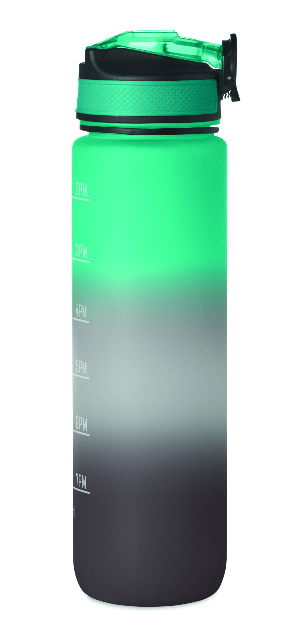 Spordiveepudel RPET-st integreeritud kõrre, pehme silikoonist huuliku, motiveeriva ajamärgistuse, ühe käega avatava klapiga kaane, turvaluku ja kanderihmaga. Mahutavus 1L.
