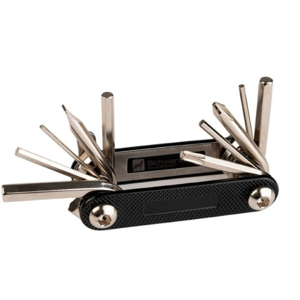 Praktilised tööriistad jalgratturitele. Sisaldab rattaparanduse multitööriista. Pakitud Schwarzwolfi karpi.