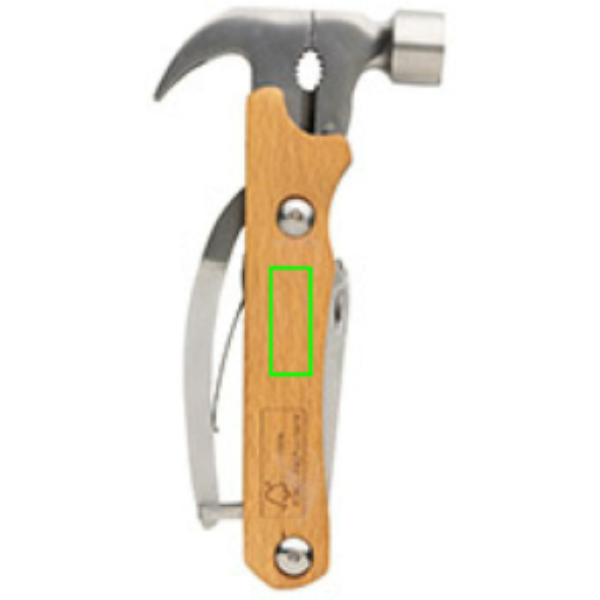 Haamer multitööriist, mis on valmistatud FSC 100% pöögipuidust, kõrge kõvadusega ja korrosioonikindlast roostevabast terasest (420). Rockwelli kõvadus 42-52. Tootel on 10 funktsiooni: tang, nael, küünis, vasar, traadilõikur, viil, kruvikeeraja, pudeliavaja, Philipsi kruvikeeraja, saag, nuga. Tera on toiduohutu. Pakitud FSC mix kraft karpi.