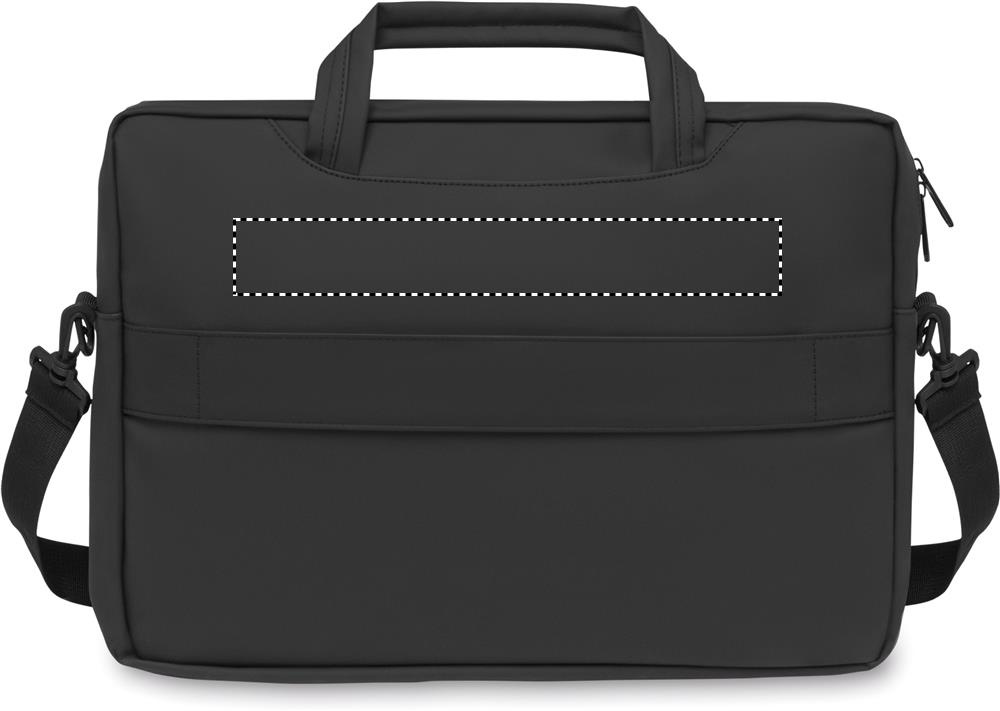 15 tuuman kannettavan tietokoneen asiakirjalaukku pehmeää PU:ta, pehmustettu takaosa. Yksi pehmustettu päälokero kannettavalle tietokoneelle ja vetoketjullinen etutasku useilla osastoilla. 210D RPET polyesterivuori. 2 kahvaa ja yksi säädettävä ja irrotettava olkahihna suojalla ja vaununpidin takana.
