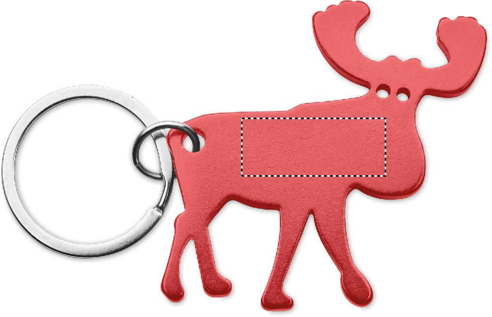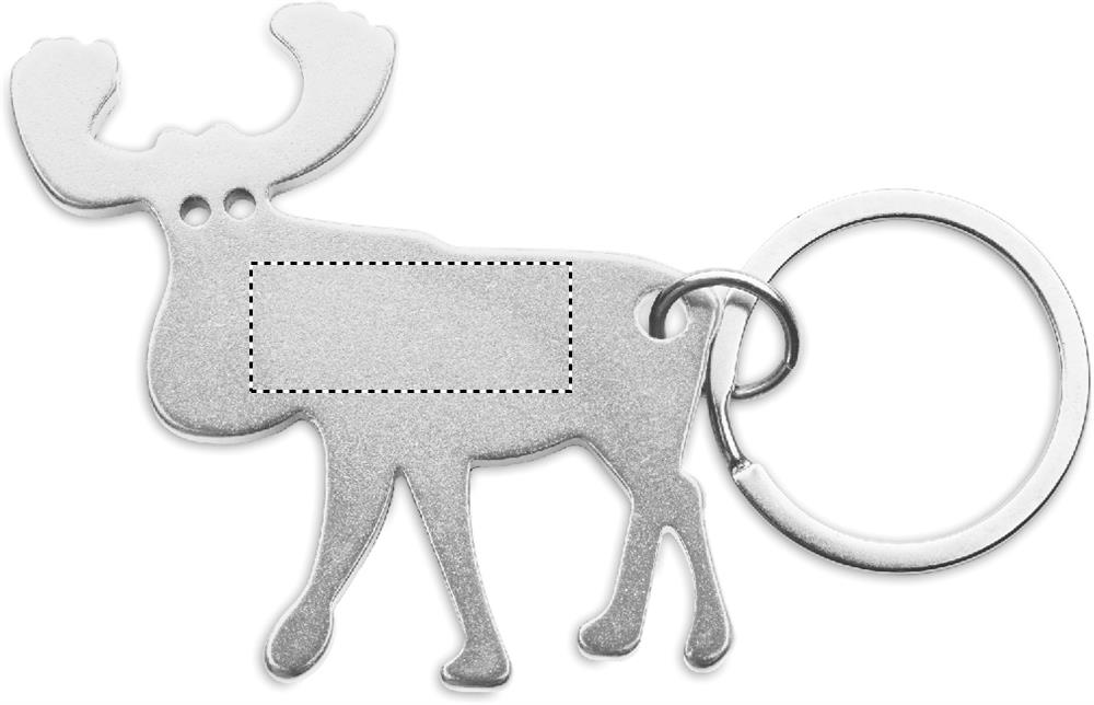 Kierrätysalumiinista valmistettu avaimenperä, jossa on poron muotoinen pullonavaaja.