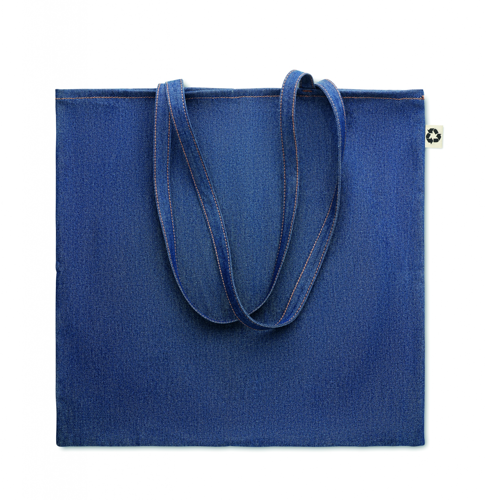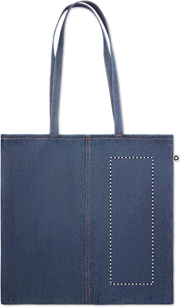 250 gr/m² denim kassi, valmistettu 50% kierrätetystä värjätystä puuvilla denimistä ja 50% normaalista puuvillasta.
