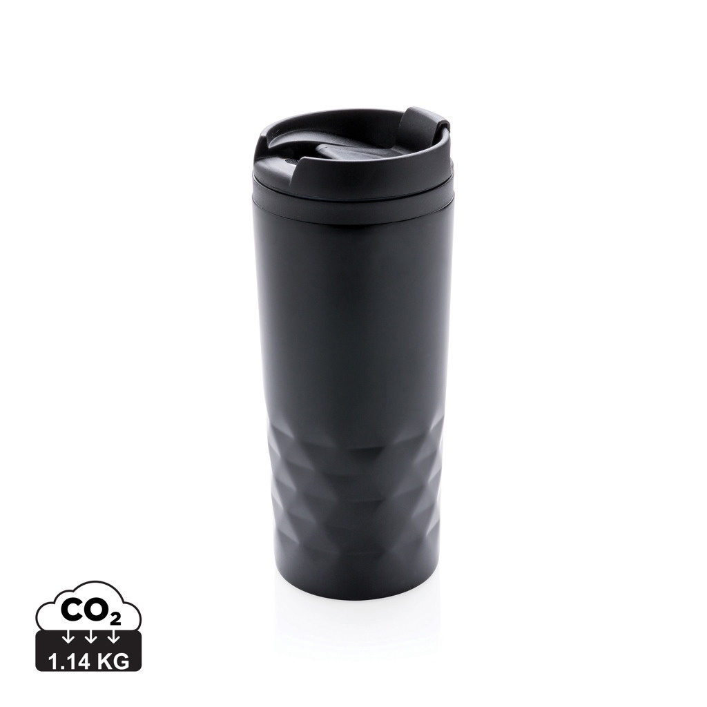 Ruostumattomasta teräksestä valmistettu trendikäs kahvimuki geometrisillä yksityiskohdilla. Sisäosa on valmistettu muovista. Vain käsinpesu. Tilavuus 300ml.