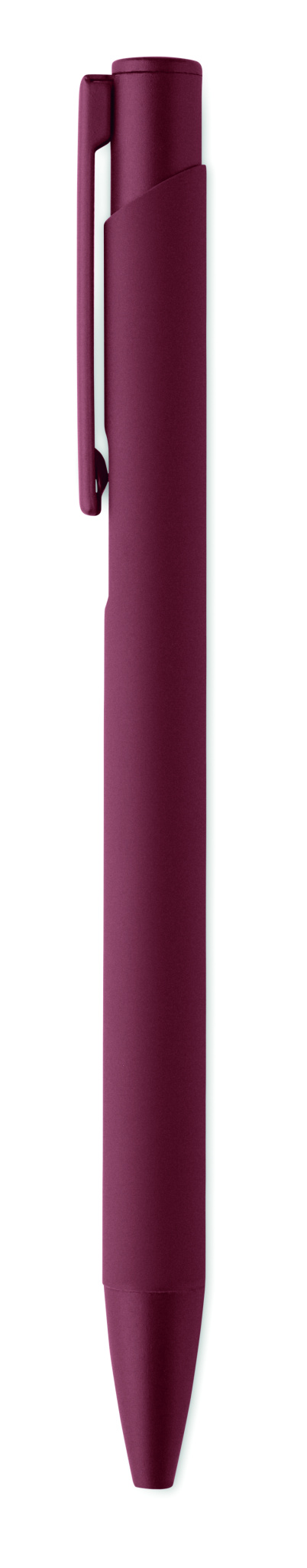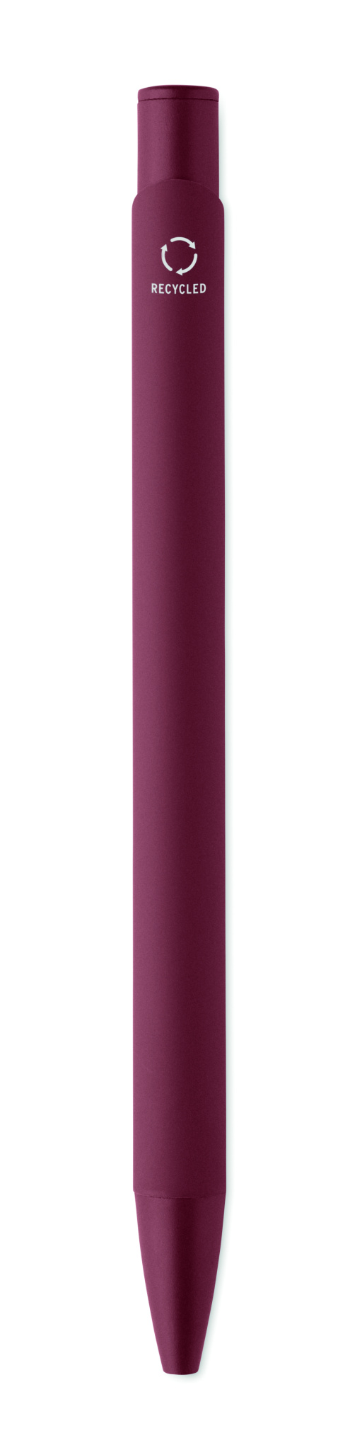 Kierrätetystä alumiinista valmistettu kynä, jossa on rautaklipsi ja värillinen kumipintainen runko. Sininen muste.