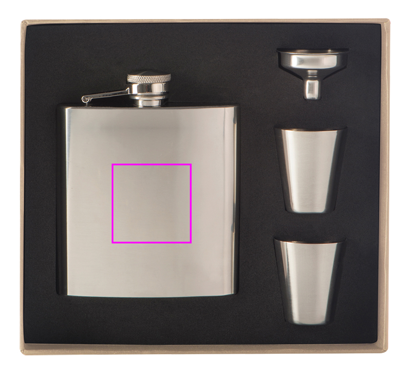 Kaunis setti, joka koostuu lantiopullosta (tilavuus 170 ml), kahdesta ammuskupista ja suppilosta, ruostumatonta terästä. Logosi laseroidaan lantiopulloon.
