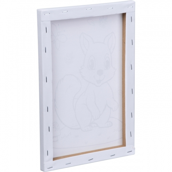 Puukehyksinen canvas-taulu, jossa orava-aihe väritystä varten. Mukana viisi eri maaliväriä (musta, punainen, oranssi, keltainen ja vihreä). Logosi on kiinnitetty yksittäiseen pakkaukseen CMYK-tarralla.