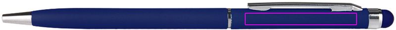Ruostumattomasta teräksestä valmistettu kuulakärkikynä, jossa on sinikirjoitus muovitäyttö ja värisovitettu kosketustoiminto pidikkeen yläpuolella. Kaiverramme logosi klipsien alle.