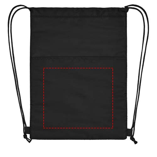 Kiristysnyörillinen jäähdytinlaukku, jossa mustat suljinnauhat. Avoin etutasku. Sopii 12 tölkille. Kestää jopa 5 kg painon.