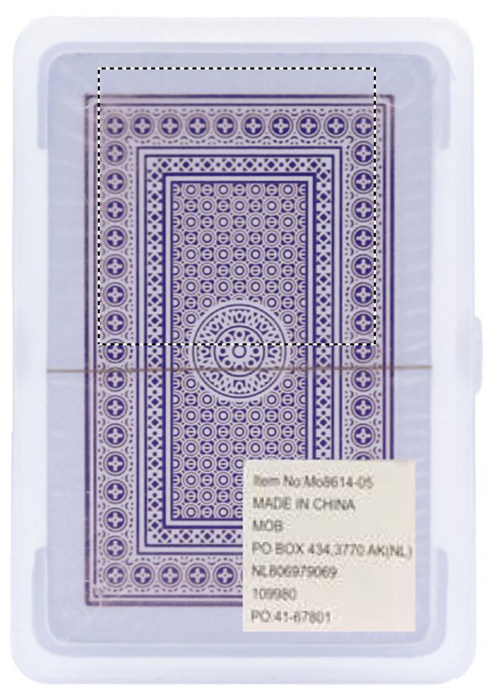Klassiset pelikortit muovikotelossa, sisältää 54 korttia.