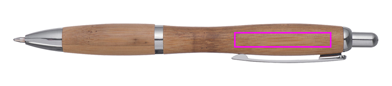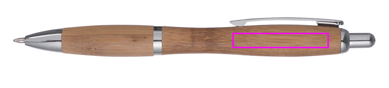 Bambukuulakynä, jossa sinikirjoitus. Kaivertamme logosi klipsien alle.