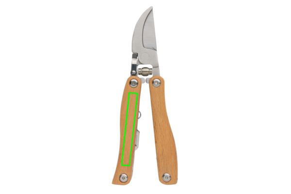 Monitoiminen puutarhatyökalu valmistettuna 100% pyökistä ja erittäin kovasta ja korroosionkestävästä ruostumattomasta teräksestä (420). Rockwell kovuus 42-52. Tuotteessa on 10 toimintoa: oksasakset, lukko, litteä ruuvimeisseli, viila, juurtenpoistaja, veitsi, lapio, saha, rikkaruohonpoistaja ja kitkemistyökalu. Pakattu FSC-sekoituksesta valmistettuun kraft pakkaukseen.