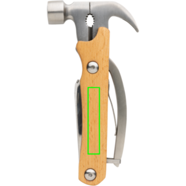 Monitoimityökaluvasara valmistettuna FSC 100% pyökistä ja erittäin kovasta ja korroosionkestävästä ruostumattomasta teräksestä (420). Rockwell kovuus 42-52. Tuotteessa on 10 toimintoa: pihdit, naulan ulosvetäjä, vasara, kaapelileikkuri, viila, litteä ruuvimeisseli, pullonavaaja, Philips ruuvimeisseli, saha, veitsi. Terä on elintarviketurvallinen, joten se sopii myös ruoalle. Pakattu FSC-sekoituksesta valmistettuun kraft pakkaukseen.