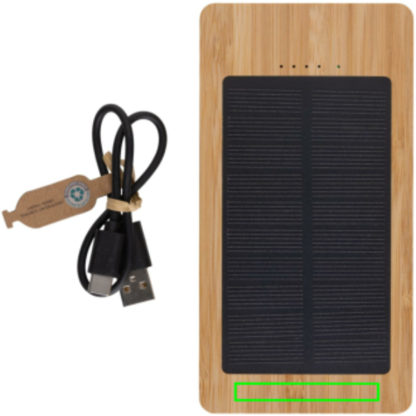 10.000 mAh aurinkokennoilla varustettu virtapankki valmistettu FSC 100% bambusta. Pankki käyttää korkealaatuisia monokiteisiä aurinkokennoja, joiden muuntoteho on 19 %. Latausnopeus riippuu olosuhteista. Pankki sisältää kestävän luokan A 10.000 mAh litiumakun. Latausnopeus aurinkokennolla: 5V/180mA. Syöttötyyppi C: 5V/2A. Lähtö: USB A: 5V/2A Tyyppi C: 5V/2A. Tuote ja tarvikkeet ovat PVC-vapaita. Mukana RCS-sertifioitu kierrätetty TPE-latauskaapeli. Pakattu FSC®-mix pakkaukseen.