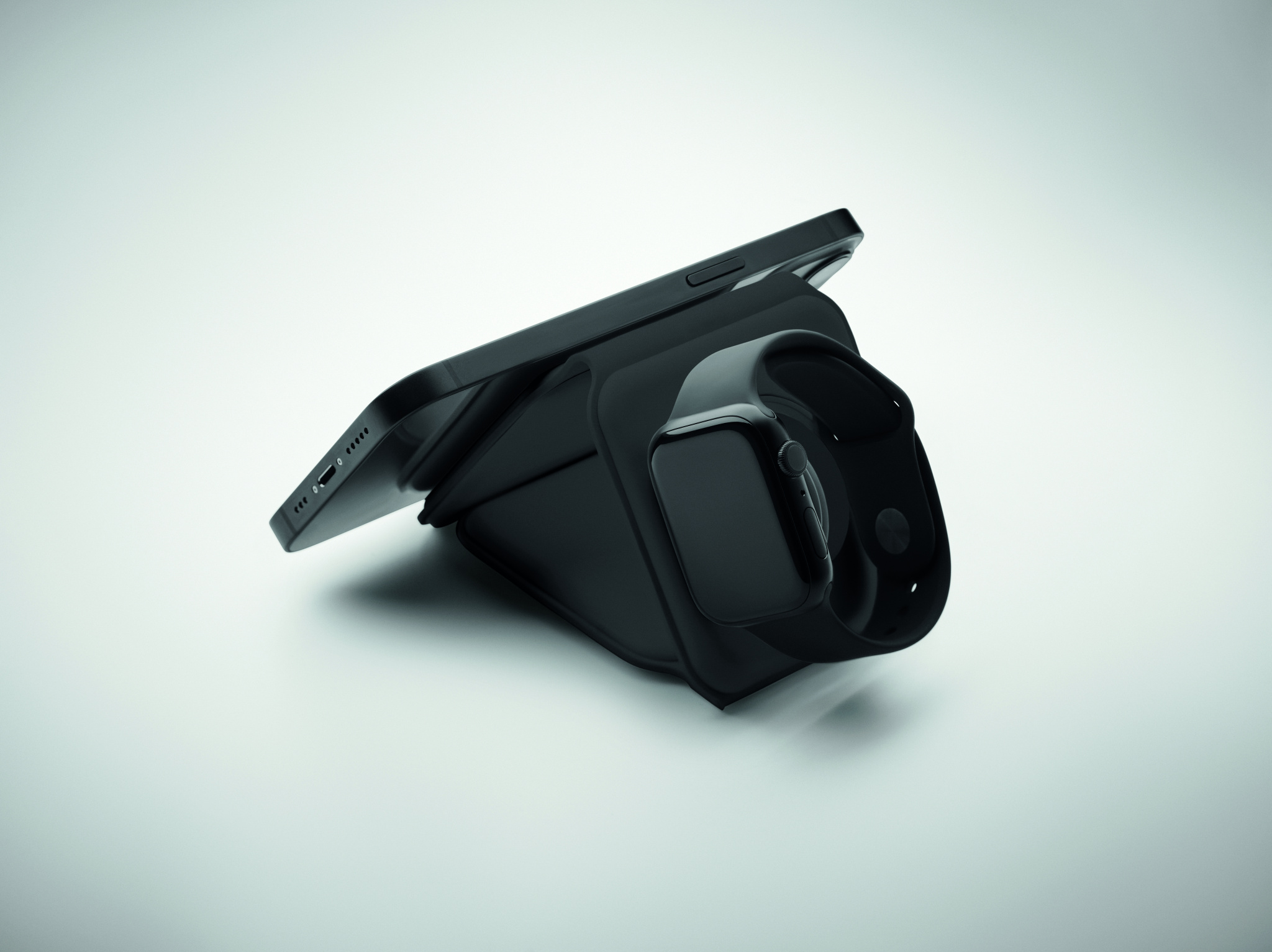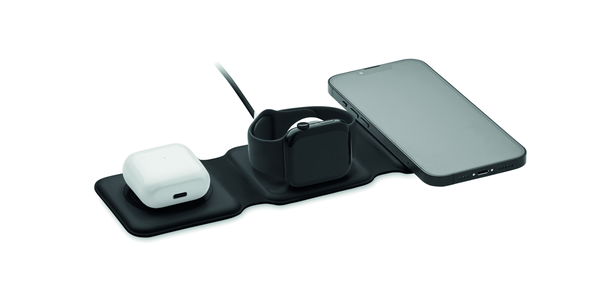 3 in 1 kokoontaitettava latausasema ABS-materiaalista. 3 langatonta latauspaikkaa. Tulo: 2-in-1 Type-C ja Type-A. Yhteensopiva QI-toiminnolla varustettujen laitteiden kanssa ( Androidien, iPhone® 8, X sekä iWatchin kanssa)