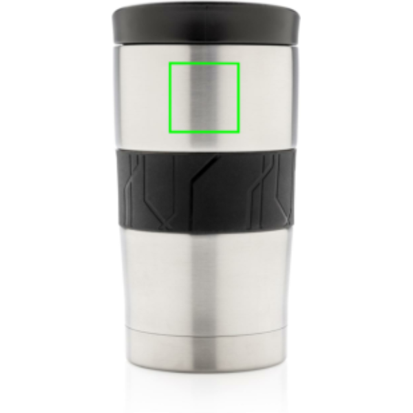 Tiivis, tyhjiöeristetty muki on valmistettu kaksiseinäisestä, ruostumattomasta teräksestä, ja siinä on silikonikahva ja liukukansi. Voidaan pestä astianpesukoneessa ja sopii useimpiin kahviautomaatteihin. Sisältö: 300 ml.
