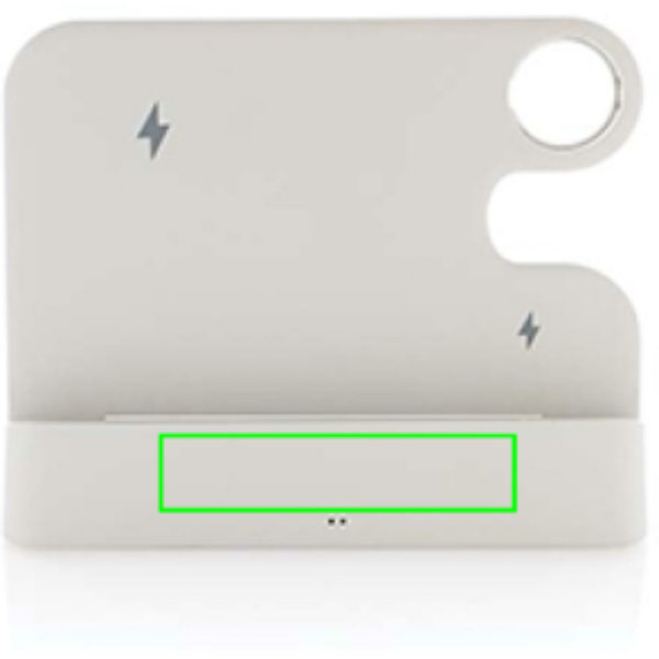 Salokāms dizaina uzlādes statīvs ar 15 W bezvadu lādētāju, kas izgatavots no pārstrādāta ABS. Ar otro 5 W bezvadu lādētāju, lai uzlādētu mazākus priekšmetus, piemēram, austiņas. Ar iWatch slotu, kas piemērots oficiālajam iWatch uzlādes kabelim. Aizmugurē ir 5V/1A USB A un USB C izejas ports, lai uzlādētu priekšmetus, izmantojot kabeli. Ar silīcija uzgaļiem apakšā, lai izvairītos no slīdēšanas, un silīcija amortizāciju pie statīva, lai tālrunis būtu ideālā stāvoklī. Kopējais pārstrādātais saturs: 80% no kopējā preces svara. RCS sertifikācija nodrošina pilnībā sertificētu pārstrādāto materiālu piegādes ķēdi. Iepakots FSC® iepakojumā. Bez PVC. Ietver RCS pārstrādātu TPE 120 cm USB A–USB C uzlādes kabeli. Iepakots FSC® iepakojumā. Bez PVC