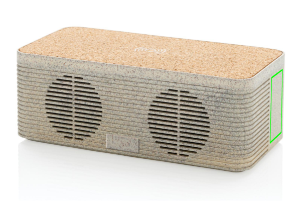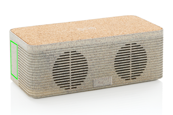 Šis gludā izskata kviešu salmi (35% kviešu šķiedras sajaukts ar ABS) un korķa bezvadu uzlādes skaļrunis ļauj apvienot iecienītāko melodiju klausīšanos, uzlādējot tālruni bezvadu režīmā. Vienkārši pievienojiet komplektācijā iekļauto 150 cm C tipa kabeli savam lādētājam mājās vai birojā, un esat gatavs doties. Tam ir 5 W bezvadu skaļrunis un 5 W bezvadu lādētājs ar C tipa ievades portu un AUX portu. Skaļrunim ir 1200 mAh akumulators un BT 5.0, kas nodrošina atskaņošanas laiku līdz 4 stundām un darbības attālumu līdz 10 metriem. Izmantojot abas funkcijas, pārliecinieties, vai vienums ir pievienots strāvas avotam.