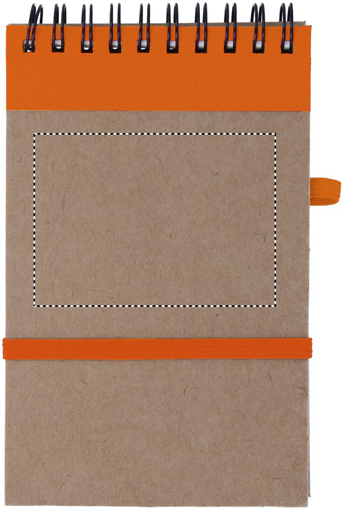 Блокнот из переработанной бумаги с ручкой в цвет. 140 страниц нелинованной переработанной бумаги (70 листов). Нажимная шариковая ручка из переработанного картона и биоразлагаемого пластика. Синие чернила. Эластичный ремешок и держатель для ручки.