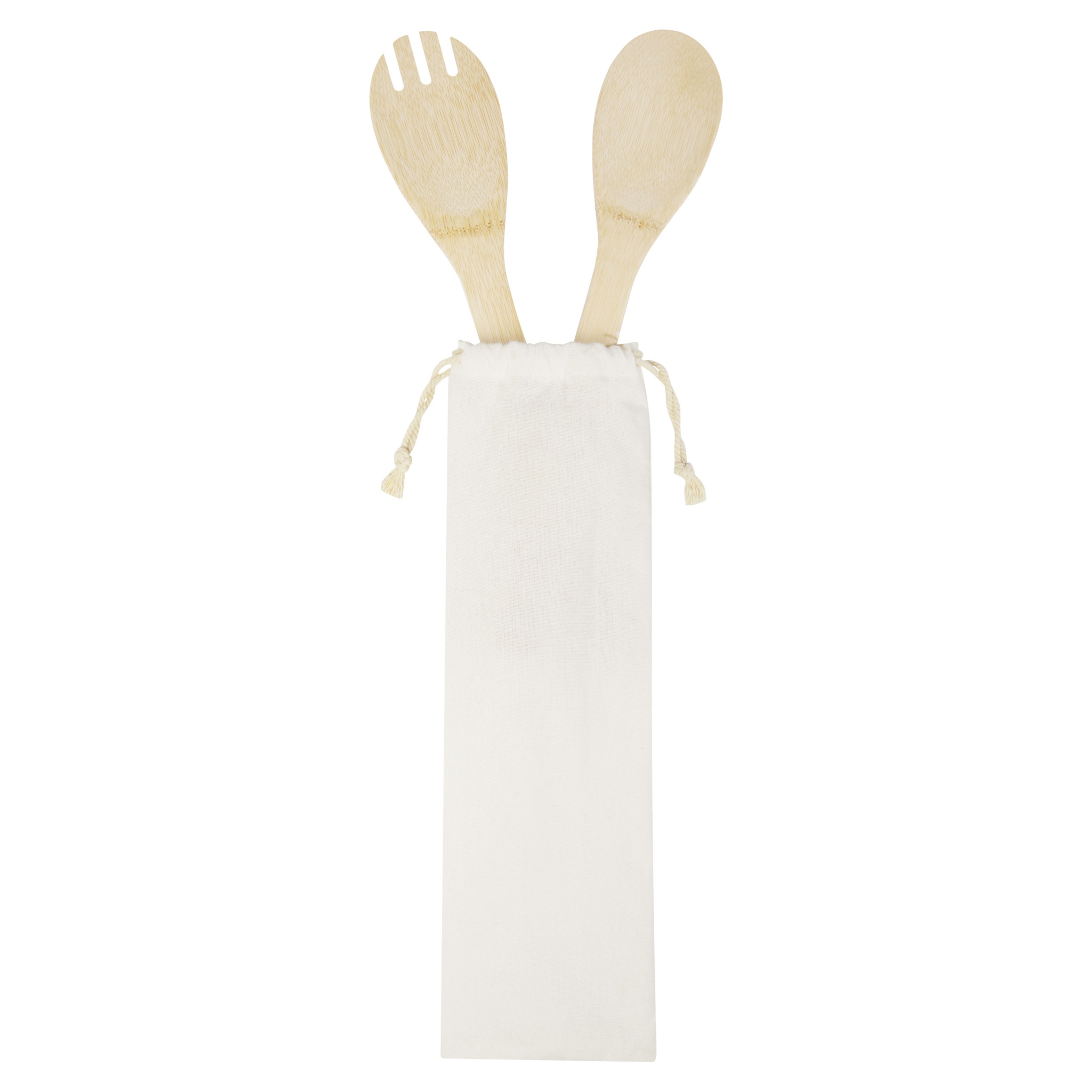 Бамбуковый комплект из салатной ложки и вилки, удобный для повседневных семейных ужинов. Используемый бамбук поставляется и производится в соответствии со стандартами устойчивого развития.