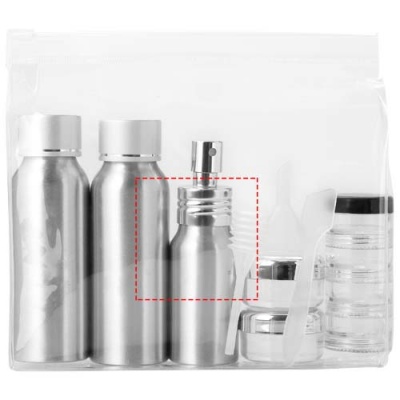 В набор входят 2 алюминиевые бутылки по 80 мл, 1 алюминиевая бутылка на 30 мл с пульверизатором, 2 баночки по 0,5 унции, 1 четырехслойная баночка, воронка, шпатель и присоска. Бутылки, воронка и другие элементы упакованы в полиэтиленовый кулек отдельно от чехла. Нанесение не предлагается на отдельные элементы набора.
