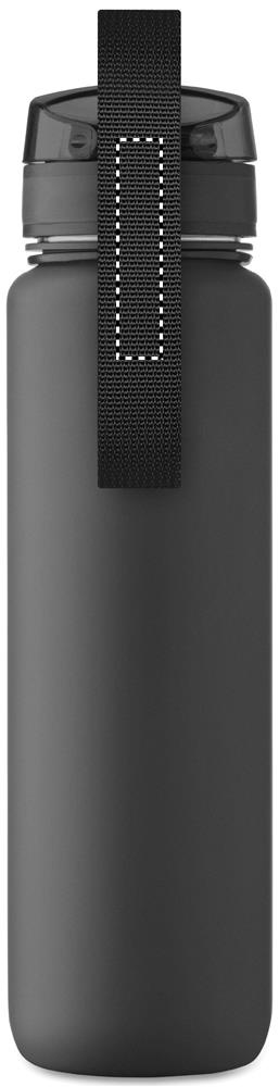 Sports water bottle in RPET, motivational time markings, one hand opening flip top lid, safety lock and carrying strap. Leak-free. Capacity: 1L.