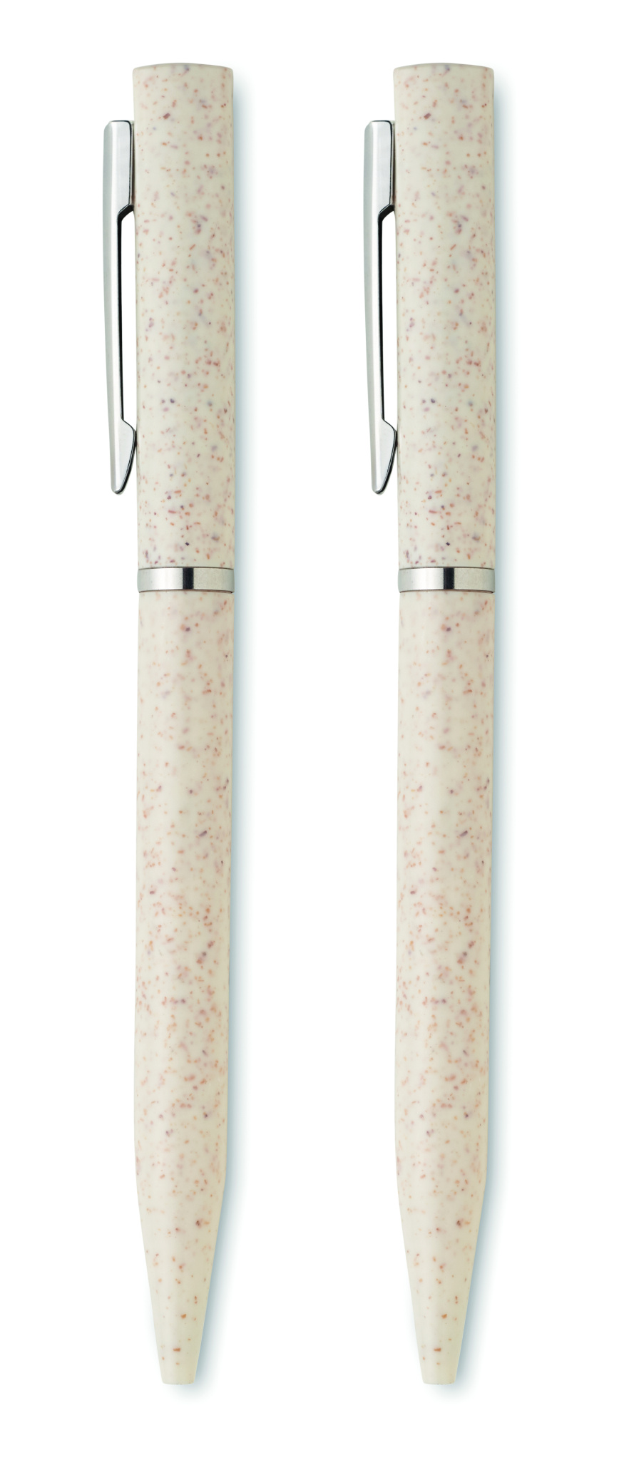 Wheat straw/ABS pen set with 1 twist ball pen blue ink and 1 twist graphite inkless ball pen. Presented in recycled paper box.