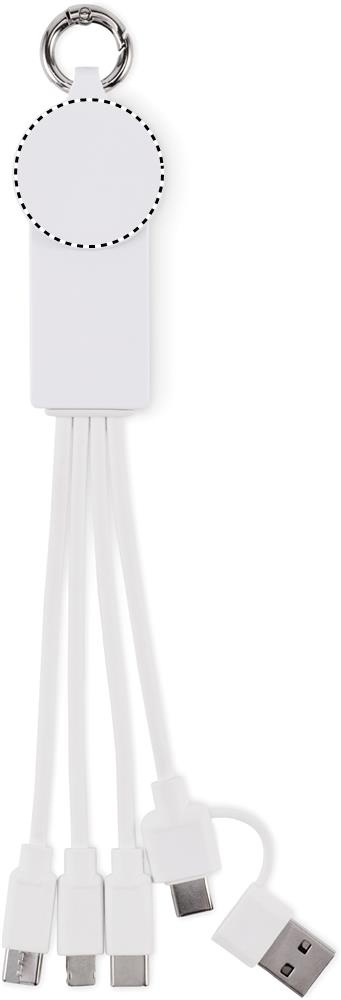 Nyckelring med laddningskabel med ingång: 2-i-1 typ-C & typ-A. Utgång: Laddning av klocka (Samsung® och Apple®), 2 x typ-C och micro-B (2 i 1 stift). Kabeln är tillverkad av återvunnen TPE.