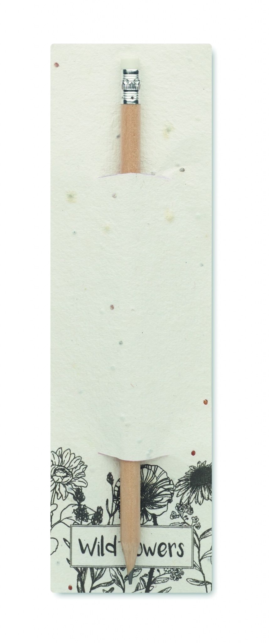 Blyertspenna i naturträ med suddgummi. I en påse med fröpapper (vildblommor).