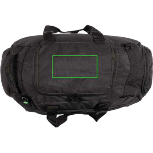 600D ribstop, framficka med organizer, sidoficka och skofack. Handtag och axelrem. PVC fri.