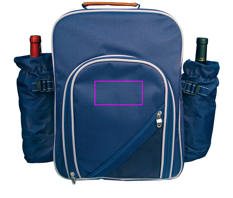 Koppla av i naturen! Njut av en mysig picknick för 4 med denna högkvalitativa picknickryggsäck i polyester. Den innehåller ett rymligt kylfack på baksidan för att hålla din mat fräsch, två kylfack för flaskor på sidorna, massor av utrustning i det främre facket som plastfat och glas, bestick, en liten plastbricka, en korkskruv, en salt och peppar shaker och en kniv. Det främre facket ger ytterligare förvaringsutrymme. Vi kommer att sätta din logotyp på det främre facket.