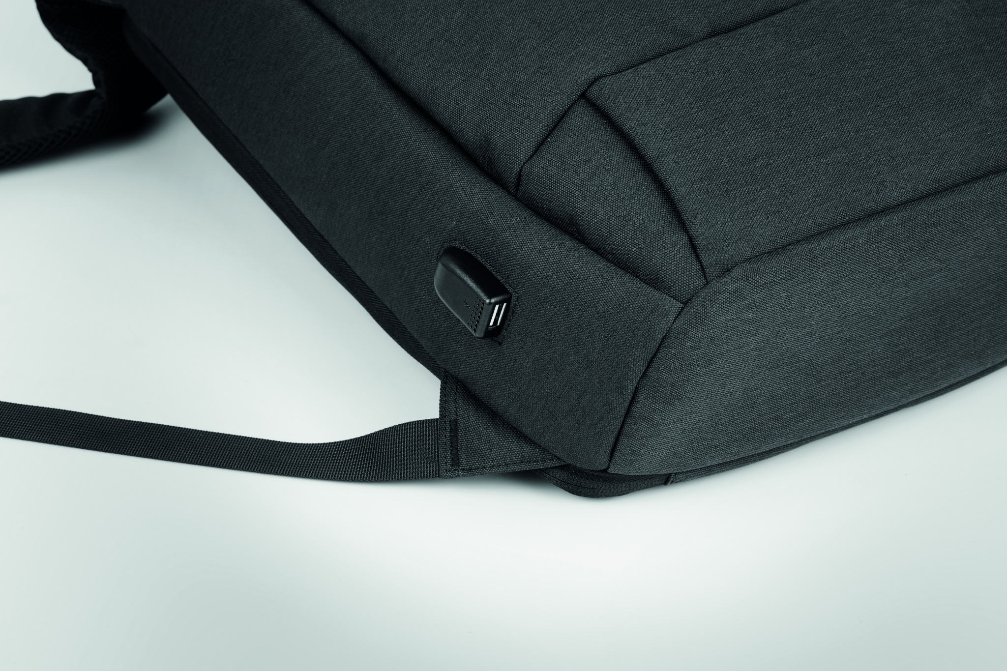 Ryggsäck med trolley-hjul i 360D polyester. Innehåller ett fack för 15 tums bärbar dator och en framficka med dragkedja. Vadderat i ryggen och på axelremmarna. Det finns även ett fack för ev. surfplatta. Har även ett skydd för hjulen när den bärs på ryggen för att undvika att smutsa ner kläderna.