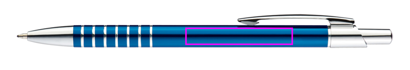 Smal metallkulpenna med blåskrivande refill och graverad greppzon. Vi graverar din logotyp under klämman.