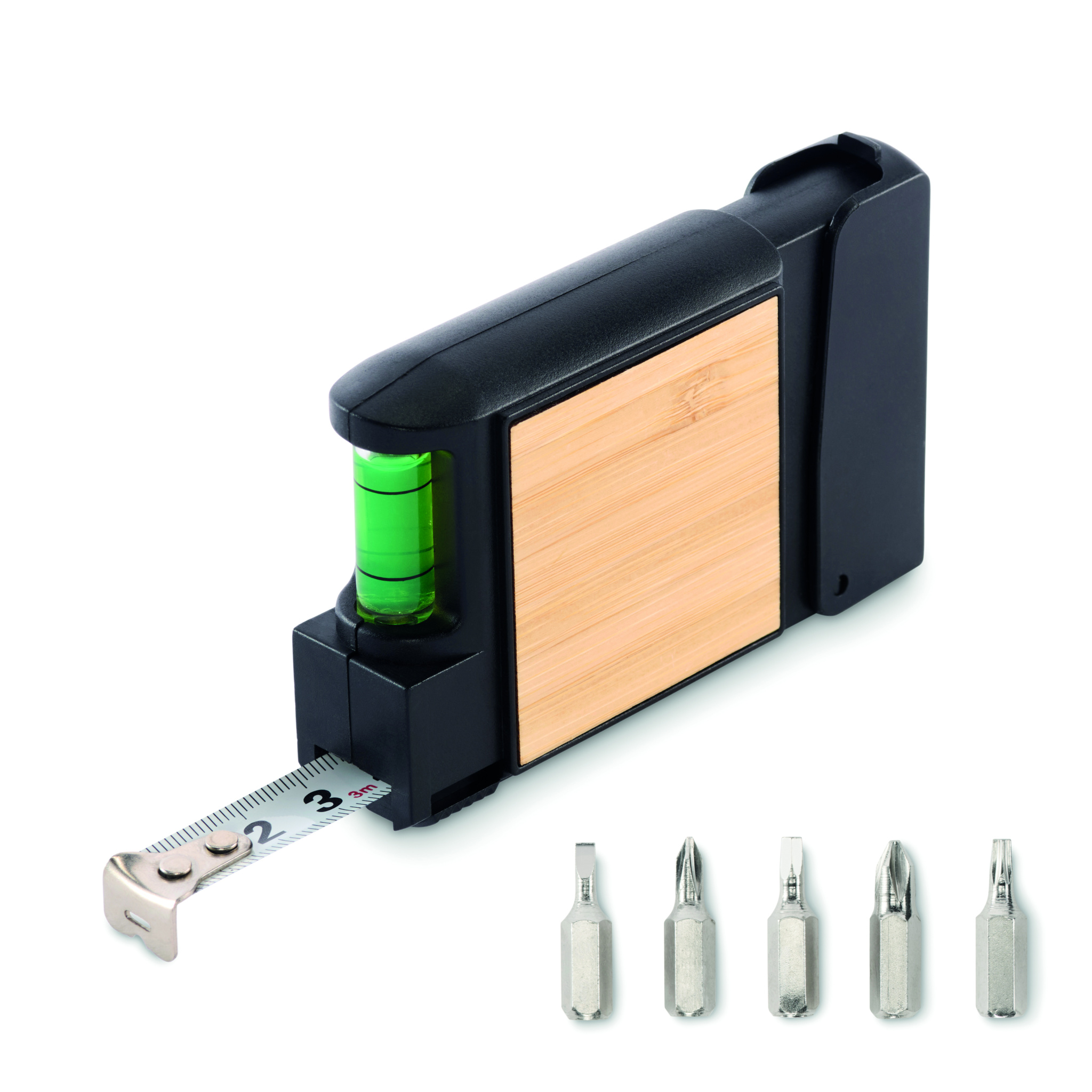 3M multifunktionellt måttband med detaljer i ABS/bambu, inklusive vattenpass och skruvmejselsats med 5 bits.