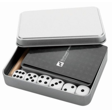 Reseuppsättning av ett spelkort och en tärning i en plåtlåda. Du kommer säkert att välkomna detta set, till exempel under din campingresa, när du och dina vänner kommer att kunna njuta av kvällen med en rolig lek eller bara hemma med din familj. Setet innehåller 54 spelkort med vattenavvisande ytbehandling, 6 tärningar, 15 sedelpapper och en penna.